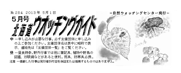 北海道ウオッチングガイドは、自然に関する行事等の情報を広く提供するため、自然ウオッチングセンターで発行しています。毎月約5、000部が無料配布されます。