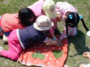 | 「春の青空クッキング」 5月17日(土) 10:10〜14:10 札幌市藻南公園 まずはみんなで「葉っぱのカルタ」のゲームをして遊びました。 この葉っぱ、じつは全部食べられる葉っぱでした。 |