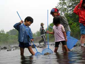 川で遊ぼう! 2日目は、ウヨロ川で魚や水生昆虫を捕まえました。魚はいったいどこにいるのかな? ハナカジカやヤマメ、ウキゴリなどなど、いろんな魚が捕れましたね。川の水は冷たかったけど、みんな魚捕りに夢中でしたね。 |