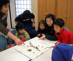 | さあ、探検にでかけよ! どうぶつたちのおとしていったステキなたからものをさがしに出掛けました。 ウサギさんのあしあとやフンがたくさん見つかりましたね。 ウサギさんは、どちらからやってきて、どちらへ行ったのでしょうか? あしあとからいろいろ想像するのもおもしろいですね。 |