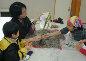 ハクチョウの食べ物を探そう! 雪がどんどん降ってきたので、みんなで拾ったハクチョウの食べ物や、湖岸にあったおもしろいものを持って室内へ。 アンケートの声 ★いろんなものを拾うのが面白かった。自然の中でまたやってほしい。 ★オオハクチョウクイズが一番楽しかった。寒かったのが一番面白くなかった。 |