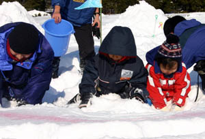 | 「わんぱくだらけの冬の大運動会」 1月17日(土) 札幌市 真駒内公園 あおぞらチーム(女の子チーム)対まぐろチーム(男の子チーム)の戦いです。 宝探しゲーム 雪の中からさがすのは、いがいとむずかしいぞ! たからものはいったいどこにあるんだぁ!ほってほってほりまくれぇ!! |