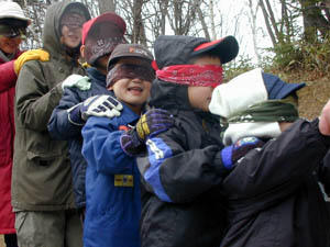 | 「めかくしイモムシ」 目かくししてイモムシになって探検だ! 目かくしすると、小さなくぼみも、急な斜面。 小さな音も、大音量。春の匂いや、鳥の声も聞こえたかな? |