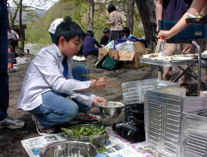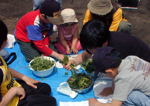 | 「葉っぱや花を食べちゃおう!」 2004年5月15日(土) 藻南公園 まずはみんなでゲームをしたあと、3つの班に分かれて料理の準備。 本日のメニューは「天ぷら&ささ茶」「草花パンケーキ&タンポポのカリカリベーコンサラダ」「よもぎ団子の豚汁」。 どれにしようか迷っちゃう・・? |