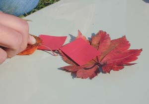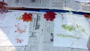 「葉っぱのたたき染め」 午後からは葉っぱの色をたたきつけて布を染めてみました。 ハウチワカエデの赤い色やタンポポなどの草の葉っぱの色が良く出ました。 |
