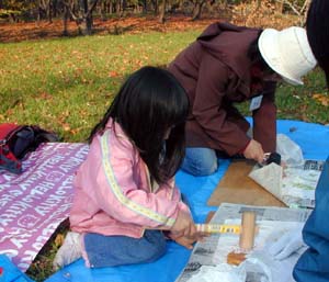 | 「たのしい木の実あそび!」 2004年9月18日(土) 藻南公園 ドングリなどの木の実を使ってゲームをしたりクラフトをしたりしました。 ドングリの中はどうなっているのかな? |