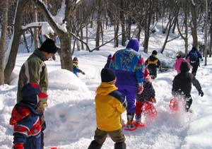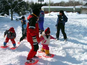 | 「冬の森探検隊!」 2005年2月19日(土) 西岡公園 カンジキを履いて冬の森を探検しました。足跡や冬芽などを発見したり、冬の森のキツネとウサギになりきって「かくれんぼ」をしたりして遊びましたよ。 「かんじき」みんな上手にはけるかな?「かんじき」でうまく歩けるかな? がに股であるくと上手に歩けるよ。 |