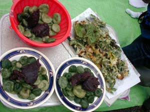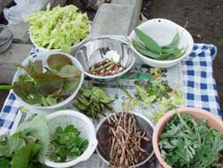 | 「本日の収穫」 ・フキノトウとフキの葉 ・タケノコと笹の葉 ・ツクシ ・エゾエンゴサクの花 ・タンポポ ・オオイタドリ ・シロツメクサ(クローバー) 料理の前に、毒草が混ざってないかチェック!山地では、猛毒のトリカブトも生えているので気をつけましょう。種類が分からない植物は食べないでね。 |