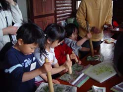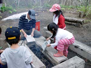 食後には、笹茶とタンポポコーヒーを飲みました。笹茶は、笹の葉っぱをはさみでチョキチョキと細かくしてからフライパンでカラ煎りします。それを煮出すと美味しいお茶に。タンポポの根で作るコーヒーはにがーい味でした。 |