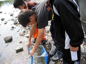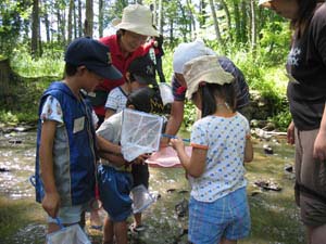 | いよいよ水生昆虫とりだ! 待ちに待った水生昆虫とりだよ。カゲロウ、トビケラ、ヤゴの3つのチームに分かれて探したよ。 |