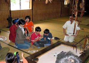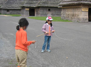 | 「アイヌ民族(みんぞく)のことを知(し)ろう!」 白老のアイヌ民族博物館で、踊りを見たり、伝統料理を食べたり、ムックリ演奏やいろんな遊びを体験しました。 ムックリ演奏体験 |