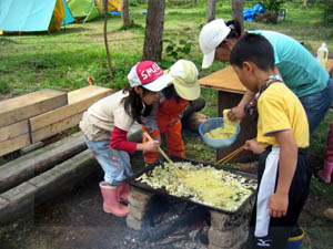 | 「キャンプだ!ごはんを作ろう!テントで寝よう!」 ご飯を炊くにはまず火起し!すごい煙だね〜 チャンチャン焼きも、おいしいよ! |