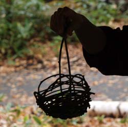 | 「カゴあみもしたよ!」 取ったつるで、かわいいカゴも編んだよ。お母さん、おばあちゃん大活躍だったよね! 綱引き、なわとび、輪投げだって出来ちゃう。つるって、なかなかおもしろいでしょ?おうちのまわりで、つるを見つけたら、取ってきて遊んでみてね。 |