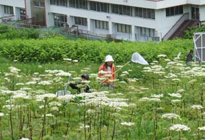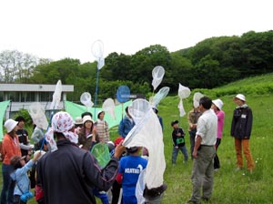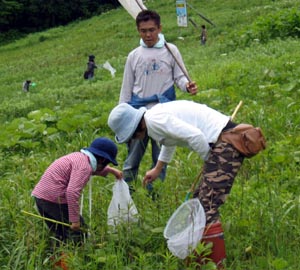 | 「昆虫ウォッチング!」No.41 2006年6月18日(日) 藻岩山スキー場(札幌市南区) なんだかすっきりしないお天気が続いていましたが、この日はとってもいい天気!23度まで上がって、昆虫探しには最適な日になりました。 虫のことなら何でも知ってる「昆虫はかせ」の村井さん(ゆうふつ原野自然情報センター主宰)が、虫の上手なとり方を教えてくれました。 |
