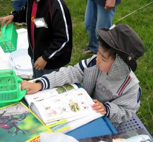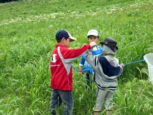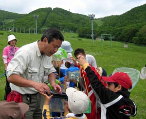 | スキー場はひろーい原っぱ。みんなめいめいに虫探しをして、とった虫のことを村井さんに聞いてみましたよ。 |