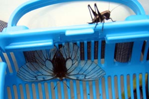| どんな虫がとれたかな? ウスバシロチョウ、モンキチョウ、ゾウムシ、カメムシ、ヒメギス・・・いろんな虫がとれましたよ。今はちょうどバッタの赤ちゃんもたっくさんいました。 |