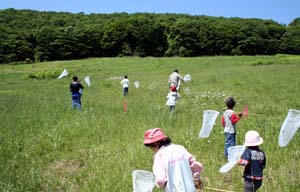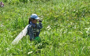 いよいよ“虫を捕まえるよ!” スキー場の草原で虫を捕まえます。 サッポロフキバッタの赤ちゃんがいっぱいいて捕まえ放題でした。 みんながねらうチョウチョはなかなか難しいみたい。頑張って追いかけないと捕まらないよ。 |