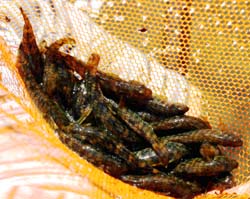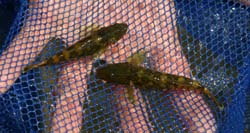 見えてる魚を追いかけても魚は捕まえられないよ。石の下に隠れている魚を探します。“おやじ”の捕り方よく見てね。 |