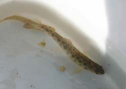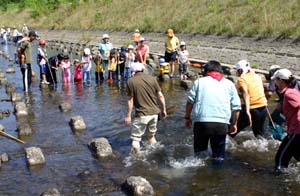 「追い込み漁」 みんなの網を一列に並べて上流から大人が魚を追い込みます。 追い込みはじめるよ! 追い込み漁でこんなに捕れちゃいました。 ほとんどハゼの仲間です。 |