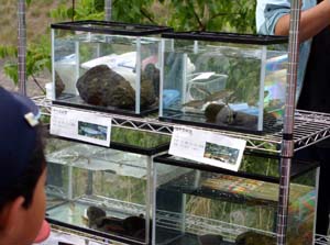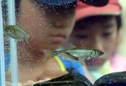 | 「よーく観察しよう!」 みんなで捕まえた魚を観察します。 サケの仲間やコイの仲間など種類ごとに水槽に分けて観察しました。 観察した後、ちゃんと飼えるかしっかり考えてもらい、持ち帰りもOKにしました。 |