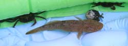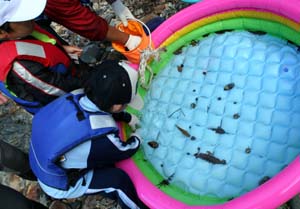 | 「タッチプール」 みんなが捕まえた生き物をプールに入れてみんなで観察しました。 |