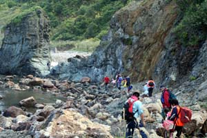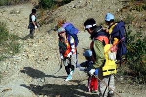 | 「じゅんびたいそう!」 今日は坂を下りたり、岩場を歩いたりして移動。そして海で遊びます。準備体操はとっても大事です。みなさん張り切って体を動かしましょう。 準備体操が終わったら、ロープをつたって、急な坂道を降ります。石がごろごろしていて滑るから気をつけて。 坂を下り終わったら、崖沿いの岩場を歩きます。 結構上り下りがあって、大変でしたね。 荷物を持っての移動みなさんお疲れ様でした。 でも冒険したみたいで、おもしろかったみたいです。 |