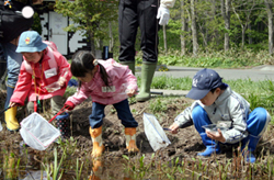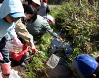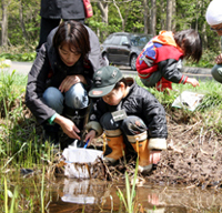 | アンケートの声 ◎ おたまじゃくしをはじめて触った. ● おたまじゃくしをたくさんとって楽しかった. ◎ 春の水の中には沢山の生き物がいるんですね〜! ● サンショウウオの卵がつるつるしているのが面白かった. ◎ もっと採って、もっと観察したかった. |