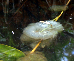 | おたまじゃくしと、サンショウウオ卵を探しに 出発だ! 森の中を水たまりを探して歩いて、サンショウウオの卵も見つけました。 サンショウウオの卵は、採ると壊れてしまうから、触らずに観察します。 |