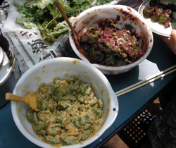 ― 本日のメニュー ― ■ タンポポごはん ■ ヨモギだんご。 ■ いろいろ葉っぱや花の天ぷら |