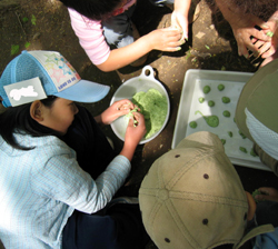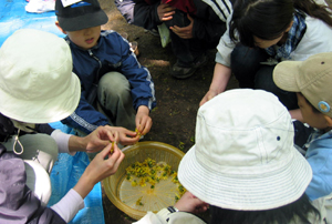 | 食べる草花を採ろう! タンポポの花とヨモギ、ササ、天ぷらにしたい葉っぱや花を採ります。 こんなにとったよ! ヨモギはヨモギの袋へ集めます。 タンポポは花の部分をご飯にするよ。天ぷらは、葉っぱも花も大丈夫。 ヨモギも、団子のほか、天ぷらもおいしいよ。 ドロノキの葉っぱは、にがーい!から、やめたほうが良いよ。 |