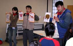 | まずは、自然ふれあい交流館のレクチャールームでゲームをしました。 クマ、キツネ、ウサギの特徴がわかるゲームでしたよ。 クマは木に登るかな?どうかな? |