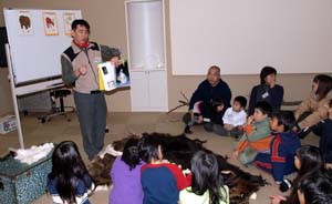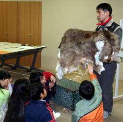 講師の早稲田さんのクマ、シカ、ウサギのどうぶつ標本を使った楽しいレクチャーを聞きました。 |
