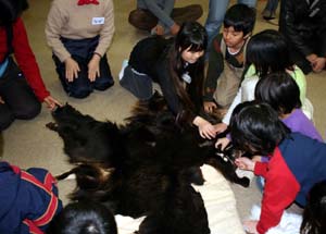 大きいね!クマの毛皮! こわい? みんな興味津々でいっぱいさわっていました。 |
