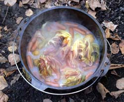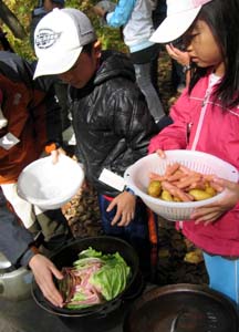| いただきます! ダッチオーブンのキャベツ煮も、ジャガイモ焼きイモもおいしく出来ました!炭火を囲んでお昼ごはんです。 ダッチオーブン |