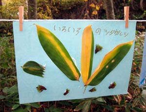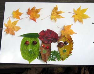 | 葉っぱでお絵かき! お散歩でひろった葉っぱを使って、画用紙にお絵かきしました。 ボンドで、葉っぱをくっつけていきます。 |