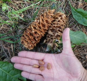 ○見られたもの:「植物」 イチイ、ヤマボウシ、チョウセンゴヨウ、キタゴヨウ、クロマツ、ノラニンジン、ハクウンボク、オオバアサガラ、ホップノキ、ハンノキ、ケヤマハンノキ、アカナラ、カツラ、エゾヤマザクラ、イヌタデ、アサダ、サワシバ、アカシデ、サワグルミ、シラカンバ、ダケカンバ、ウダイカンバ、ヤエガワカンバ など 「野鳥」 ヒヨドリ、ヤマガラ、ゴジュウガラ、カケス など 「その他」 エゾリス チョウセンゴヨウの実(エゾリスが食べた跡) |