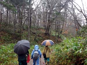 ○見られたもの:「植物」カノツメソウ、マムシグサ、アカエゾマツ、トドマツ、オシダ、エゾフユノハナワラビ、キツリフネ、ヤマドリゼンマイ、クサソテツ、コウヤワラビ、オオメシダ、トリアシショウマ、サラシナショウマ、アサダ、チョウセンゴミシ、キンミズヒキ、ユウゼンギク、エゾノコンギク、ジュウモンジシダ、アカソ、クサコアカソ、ミゾシダ、ゲンノショウコ、ミヤマベニシダ、ミヤマガマズミ、ハウチワカエデ、フッキソウ、ミズキ、ヤマグワ、ノブキ、ムカゴイラクサ など 「野鳥」 ウグイス、ツグミなど 「その他」 エゾマイマイ、サッポロマイマイ、ザトウムシ、ミカドフキバッタ、ヒトヨダケ など |