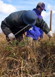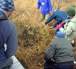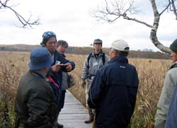 | 「標津湿原のササ進入と定点写真撮影調査」 @標津湿原のササ進入調査 ササは、湿原の乾燥化の目安といわれてきたが、最近では多少のササは湿原にもともとあるものではないかということも言われています。標津湿原のササは今どんな状況なのかを知るためにササの調査を実施します。調査は、ササの進入部分に黄色いラインを張って、毎年調査を実施し、そのラインからササがはみだして育っていくのかどうかを観察します。 引いたラインは3本。 ライン1:湿原の真ん中あたりのササがまばらで、湿原の状態が良く栄養分が無く水が多いのためササが小さいまま維持していると思われる部分 ライン2:ポー川から続く密度の濃いササの最先端。側溝に囲まれた範囲にある。増えていく可能性があり、側溝を越えて増えるかどうかを見極める必要がある。 ライン3:ライン2のポー川から続く密度の濃いササの密度の濃い部分。密度の濃い部分が広がるかどうかを観察する。 来年、また調査を実施して、ササの状態を確認します。ササが増えていくようだと対策を考える必要があります。 |
