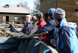 | 「開拓の村で昔の話を聞こう!」 開拓の村にある資料館や復元番屋と農家で展示物を見ながら、そしてお茶を飲みながら、伊茶仁老人クラブの皆さんと一緒に「この道具はこうやって使った」とか、「昔はこうだった」というような話をワイワイしました。 みんなで話をした内容は、書ききれないのですが、箇条書きで一部紹介します。 ・舟は番屋に引き上げていた。番屋の前まで来たら、方向展開して後ろから引き上げた。結構大きい船も上げていた。 ・舟を上げるのも、10人くらいの人がいれば上げられる。大きい船は馬を使っていた。舟を引っ張る道具「カグラサン」。 ・臼と杵は大抵の家は持っていた。29日はついたらダメな日だから、みんな28日に餅つきをした。お正月だけではなくお祝い事などあれば餅をついた。芋農家は畑が終わったら、漁師も網が終わったときに餅をついた。 ・漁師の網を固定するのには、「叺(かます)」に砂を入れて使った。 ・「叺(かます)」=藁で編んだ袋。ジャガイモや塩、何でも入れるのに使った。農家には、「叺(かます)」を背負子にしたものがある。 ・標津川は町と平行に流れていた流れを切り替えた。切り替えた跡にはフナとかたくさん残っていて子供たちが捕りに行っていた。 ・湿原には、よくフレップの実を子供たちが採りに行っていた。 などなど |
