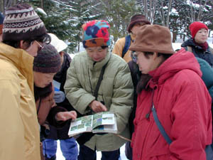 | 第4回目 円山公園 2004年1月19日(月) 10:00〜12:00 ○天候:曇 ○参加者:11名 ○講 師:自然ウオッチングセンター 島田、村野 ○研修生:鎌田 ○見られたもの:「植物」ナナカマド、ヤドリギ、スギ、キササゲ、ヤマモミジ、サワラ、ニワウルシ、バンクスマツなど 「野鳥」ハシブトガラ、ゴジュウカラ、ウソ、コゲラ、シジュウカラ、ヤマガラ、アカゲラ、シメ、スズメなど 「その他」エゾリスの巣材をとった痕、エゾリスの足跡 など |