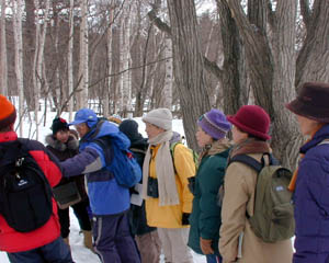 | 第5回目 西岡公園 2004年2月16日(月) 10:00〜12:00 ○天候:曇 ○参加者:12名 ○講 師:自然ウオッチングセンター 島田、村野 ○研修生:鎌田 ○見られたもの:「植物」ドイツトウヒ、ケヤマハンノキ、ヤマブドウ、ヤチダモ、オオバボダイジュ、ミズナラ、イタヤカエデ、ヤマモミジ、ツリバナ、ハウチワカエデ、コクワ、キタコブシなど 「野鳥」ヤマガラ、ゴジュウカラ、シジュウカラ、ヒヨドリ、カケス、ハシブトガラ、アカゲラ、シメ、ハシブトガラス、コゲラ、エナガ、オオアカゲラなど 「その他」エゾリス目撃、エゾリスの食痕、虫こぶ(ナラリンゴフシ) など |
