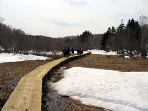 上流の湿原は水の流れがあるところから雪がなくなっていました。木道も新しくなっていて歩きやすい! ミズバショウの芽が大きくなって、ドクゼリの浮く根っこが良く目立ちました。 (2006年3月28日 さっぽろ自然散歩 西岡公園より) 講師:島田明英、村野道子 レポート:鎌田恵実 |