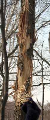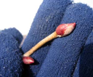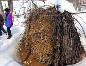 | ←オオバボダイジュの倒木の根っこ。倒れているけどまだちゃんと生きているんです。こんなきれいな冬芽も大きく膨らませています。 「木の大きさから比べると意外に根っこは浅くて狭いねー」って皆さん言われてました。 ホントですね。木は、枝の広がりと同じだけ根っこも広がって伸びているそうです。周りに木が混んでいて枝が伸ばせないと、同じだけ根も伸ばせないということですね。 |