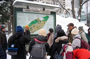 | 第5回目 北大構内 2009年2月16日(火)10:00〜12:00 ○天候:雪 ○参加者:14名 ○講 師:島田、村野 研修:鎌田、中嶋 |