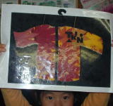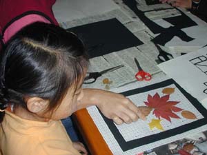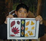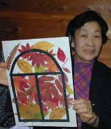 「落ち葉のステンドグラス」 いよいよ今日のメインイベントの「落ち葉のステンドグラスです。 「作り方」 ・必要なもの:落ち葉、はさみ、カッター、黒の画用紙(枠用)、透明粘着フィルム @落ち葉を集めて押し葉にしておく。 A画用紙で好きな形の枠を作る。 B粘着シートに枠を張り付ける。 C枠の上に落ち葉を貼っていく。 Dきれいに出来たら、窓に貼って光を透かして楽しみます。 |