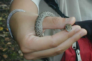 子どもたちが、夢中になって触っているのは、アオダイショウの子供です。