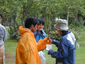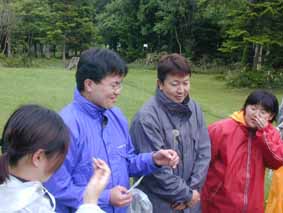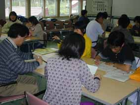 | 講義、実習2 | ○室内講義「環境学習」 ・環境学習とは? 学習ではなく、解決しなくては行けない。そのための学習。そのための行動をする。 ・行動のために必要なことは? 1人では無理。みんなで解決しなければいけない。行動→知識・技術・意欲 意欲がないと進まない。 ・学習とは? 「好き・親しみ・大事に思う」⇒「発見」⇒「理解」⇒「問題を解決する手順」→「行動」→「確かめる(どの段階で間違っていたかを振り返る)」 まず、「好き・親しみ・大事に思う」が無いと始まらない。 |