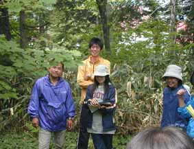 | ○グループごとに発表 ルートを歩きながら、その場所に来たらグループに声を出して教えてもらい、発表してもらいました。 ←笹笛 |