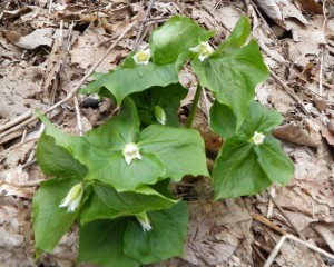※5月8日の観察会で見られたもの 天候:くもり 植物:シラカンバ(蕾)、トドマツ、アキタブキ(花)、ミヤマエンレイソウ(花)、ヒメイチゲ(花)、ハルニレ(花)、フッキソウ(花)、マイヅルソウ(蕾)、クルマバツクバネソウ(蕾)、キタコブシ(花)、エゾニワトコ(蕾)、オオカメノキ(蕾)、ミヤマガマズミ(蕾)、ホオノキ など 野鳥:ノスリ、カワガラス、キセキレイ、ハクセキレイ、モズ、アカゲラ、コゲラ、センダイムシクイ、エゾムシクイ、ヤブサメ、ハシブトガラ、シジュウカラ、ヤマガラ、ゴジュウカラ、カワラヒワ、シメ、ハシブトガラス その他:ネズミ食痕など ミヤマエンレイソウ |