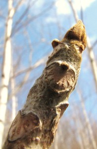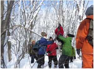 ※3月4日〜カンジキで歩こう〜観察会で見られたもの 天候:晴 植物:ツルウメモドキ、サルナシ、ミズナラ、ミヤマガマズミ、イタヤカエデ、オオカメノキ、シラカンバ、カラマツ、ホオノキ、ヤマウルシ など 野鳥:ハシブトガラ鳴き声、ゴジュウカラ鳴き声 その他:エゾリス足跡、キツネ足跡、イヌ足跡、蛾のサナギ、エゾリスの巣材取り跡 ヤマウルシ冬芽 |